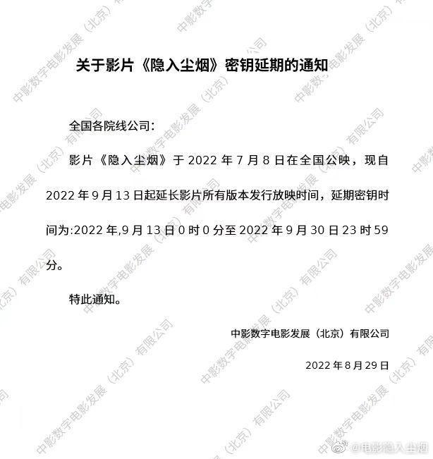 由李睿珺执导,武仁林、海清主演的电影《隐入尘烟》密钥再次延期,宣布延长上映至9月30日。该片于2022年7月8日在全国公映,据灯塔专业版数据显示,目前电影累计票房已突破3000万元,豆瓣评分也从最初的7.8涨到了8.5,有超过20万人参与评价。